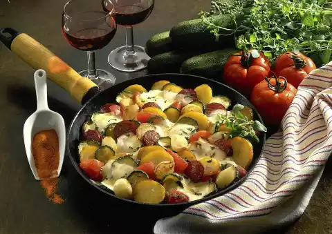 Fry onion slices and sausage slices in the frying fat. Add tomatoes and zucchini. Fry everything for about 5 minutes and season with salt and pepper. Put the potatoes back into the pan. Put the processed cheese on the vegetables and let it melt for about 1 minute with the pan closed.