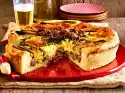 For the dough mix flour and 1 teaspoon salt. Add 160 g butter, 50 g Gouda and 6 tbsp water and knead first with the dough hooks of the hand mixer, then with your hands to a smooth dough. Halve the dough, wrap in foil and chill
