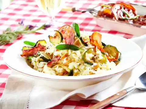 Stir the zucchini mixture and 50 g parmesan loosely into the risotto, season with salt and pepper. Take the baking tray out of the oven. Sprinkle the risotto with some pancetta, sage and remaining parmesan and possibly with ground pepper.