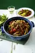 Peel and chop the garlic. Wash and clean the zucchini, halve lengthwise and cut into slices. Heat 2 tablespoons of oil in a frying pan. Brown the zucchini in it. Season with salt, pepper and sugar. Add pine nuts and garlic and fry briefly.