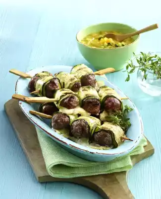 Form 24 small rolls and place one roll on each zucchini strip. Place mozzarella strips on the rolls and roll up the zucchini strips with the fillings. Put 3 rolls on 1 wooden skewer