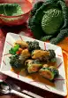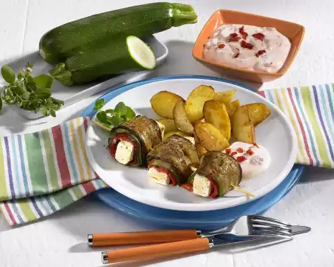 Drain the roasted peppers. Halve 6 peppers lengthwise. Place the zucchini slices and the peppers on top of each other. Place a piece of feta cheese on each and roll up. Put 3 rolls on each skewer.