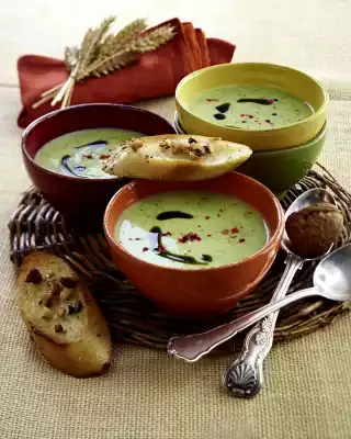 Heat 2 tablespoons of oil in a saucepan. Fry onion, garlic, zucchini and potatoes for 3-4 minutes. Deglaze with broth and cook covered for about 15 minutes. In the meantime heat 2 tbsp. oil in a large, coated pan. Fry the slices of bread on both sides until golden brown and finally add the chopped walnuts. Remove the finished slices of bread, season with salt and spread the walnuts on top