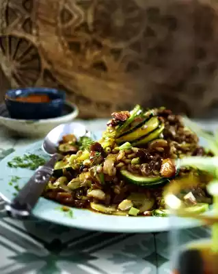 Soak the raisins in about 150 ml of warm water. Coarsely chop the almonds, roast them in a pan without fat until golden brown, take them out and let them cool down. Peel onions and garlic, dice or chop finely. Clean and wash the zucchini, dab dry and cut into very thin slices