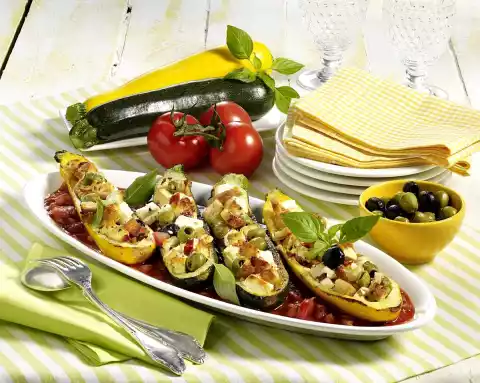 In the meantime mix bread cubes with cheese mixture. Take out the zucchini and put them on a baking tray. Fill the zucchini with the bread mixture and cook in the preheated oven (electric cooker: 175 °C/ convection oven: 150 °C/ gas: level 2) for about 25 minutes.