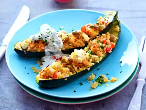 Mix tomatoes, rosemary, olives and onion into the Bulgur. Season with salt and pepper. Clean and wash the zucchini, cut in half lengthwise, scrape out the seeds with a teaspoon. Place halves side by side on the fat pan of the oven and fill with the bulgur mixture. Bring the stock to the boil and pour on. Add 1 sprig of rosemary to the fat pan. Bake in the preheated oven (electric cooker: 200 °C/ convection oven: 175 °C/ gas: see manufacturer) for approx. 20 minutes