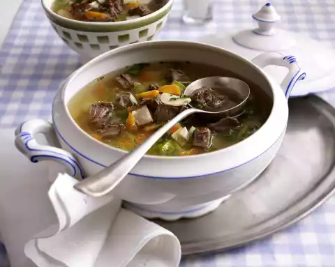 Cook the vegetables for about 10 minutes. Remove meat from the bone, remove connective tissue. Cut meat into pieces, reheat in the broth. Season to taste with salt and pepper. Chop parsley leaves and sprinkle on top.