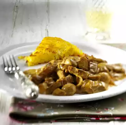 Peel the shallots and cut into slices. Clean and trim the mushrooms and halve them according to size. Wash the meat, dab dry and cut into strips. Heat clarified butter. Fry the meat for about 6 minutes, turning it over and taking it out.