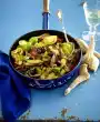 Clean and clean the mushrooms and, depending on their size, possibly halve them. Peel 2 onions and cut into slices. Wash the meat, dab dry and cut into strips. Heat the lard in a roasting pan, fry the meat vigorously in portions, remove and season with salt and pepper. Add mushrooms and onions to the frying fat and fry for 2-3 minutes, turning. Dust with flour and sauté briefly. Add white wine and cream, bring to the boil, stir in stock. Simmer at low heat for about 10 minutes, put aside