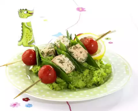 Salmon Skewers With Pea Puree