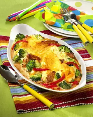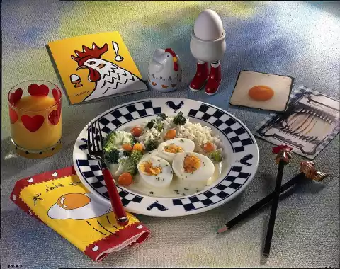 Eggs In Cheese Sauce With Rice, Broccoli And Carrots