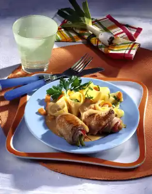 Mini Turkey Roulades With Ham And Spring Onions, Carrots And Noodles