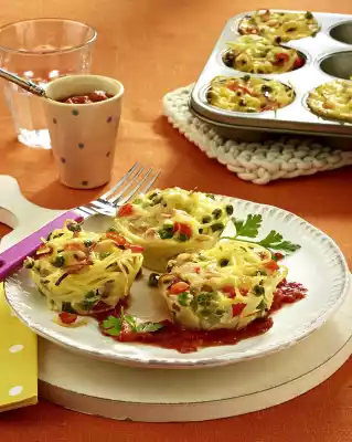 Nests Of Pasta With Ham, Peas And Peppers