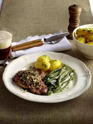 Neck Chops With Mushroom And Onion Crust, Cream Beans And Parsley Potatoes