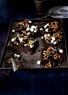 Chocolate Brownie With Raspberries, Salt Pretzels And Marshmallows