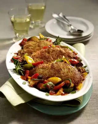 Veal Escalope With Pecorino Crust On Ratatouille Vegetables