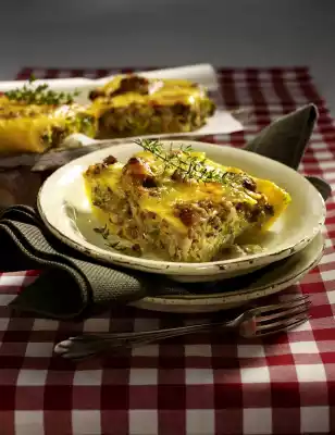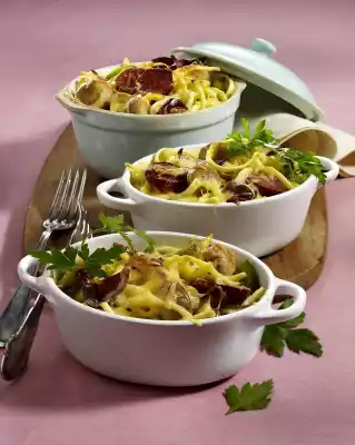 Spätzle Casserole With Cabanossi, Peppers, Mushrooms And Egg Milk