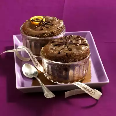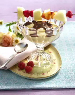 Fruit Skewers On Almond Pudding With Chocolate Sauce