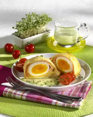 Eggs In Puff Pastry Coat With Smoked Salmon And Horseradish On Cress Sauce