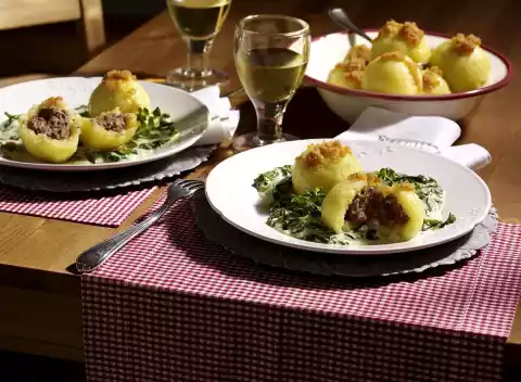 Potato Mince Dumplings On Creamed Spinach