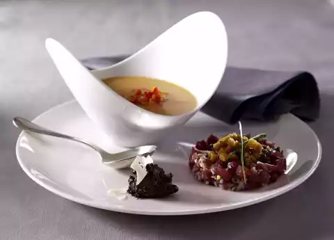 Cazpacho With Tuna Tartare And Olive Pesto
