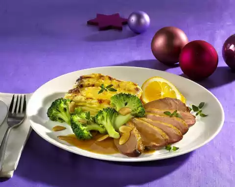 Duck Breast With Almond Broccoli And Potato Gratin