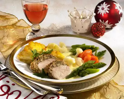 Pork Tenderloin With Nut And Cinnamon Topped With Potato Gratin And Hollandaise Vegetables