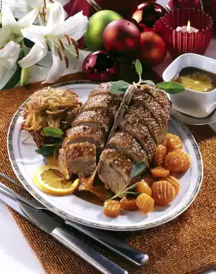 Stuffed Turkey With Baked Fruit To Spicy Red Cabbage And Deep-fried Potato Taler