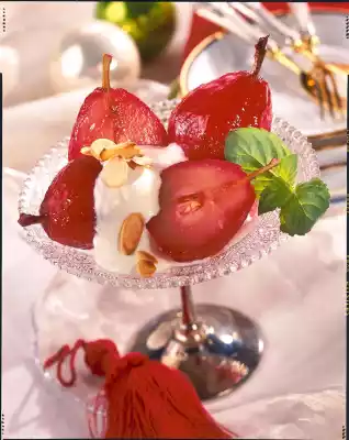 Red Wine Pears With Amaretto Cream