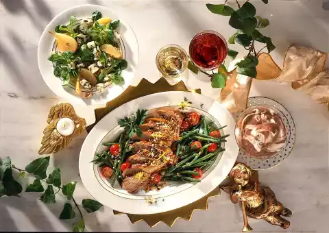 Turkey With Pumpkin Flan (with Cranberries And Herbs As Decoration, With Mushrooms)
