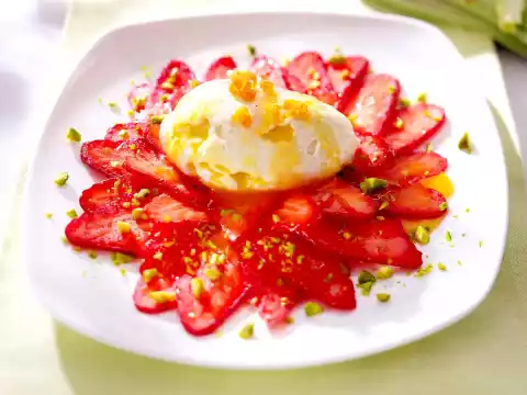 Light Orange Mousse On Strawberry Carpaccio