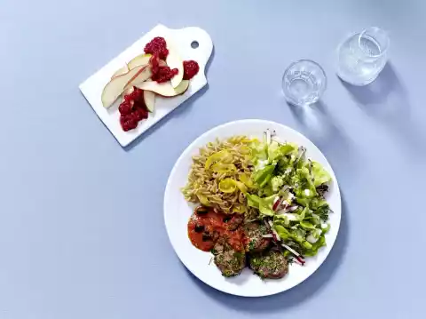Pork Fillet With Noodles, Salad And Dessert According To The Mayo Diet