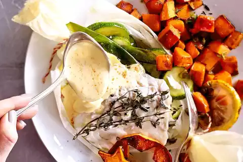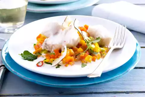 Fish Fillet On Carrot-mango Confit With Coconut Foam Sauce