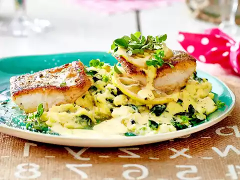 Crispy Zander Fillet With Spinach Polenta And Lightning Sauce