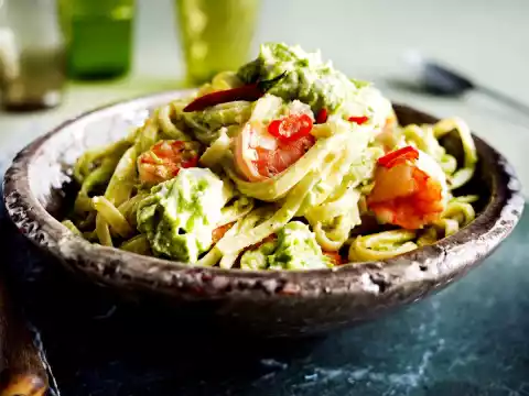 Noodles With Avocado Feta Cream And Chili Prawns