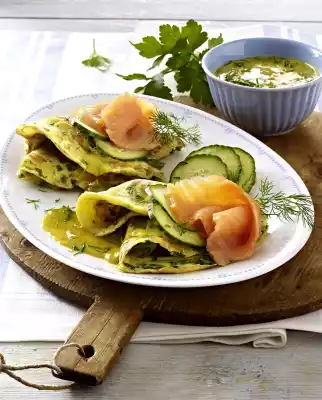 Herb Crepes With Salmon And Honey Sauce