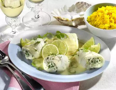 Plaice Rolls With Herb Sauce, Lime Sauce And Rice