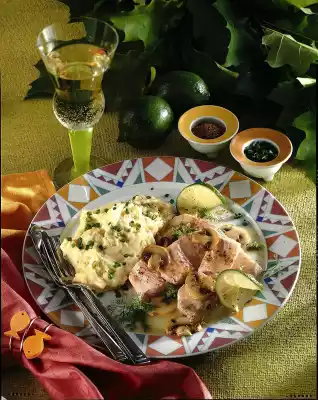 Steamed Salmon With Mashed Potatoes And Mushrooms