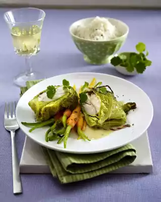 Savoy Cabbage Fish Packet With Curry Cream To Glazed Coriander Carrots And Basmati Rice