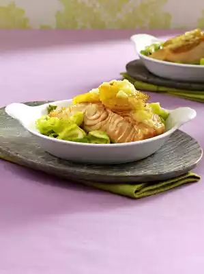 Potato And Salmon Gratin With Cream Chanterelles