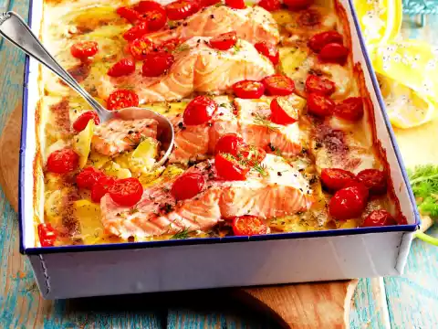 Potato And Salmon Gratin With Dill Cream