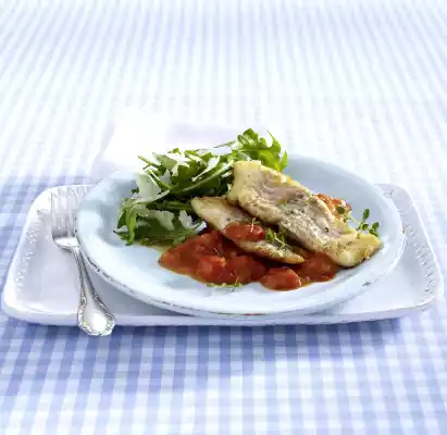 Fish Fillet With Tomato Sauce And Rocket Salad (separating Food Protein Dish)