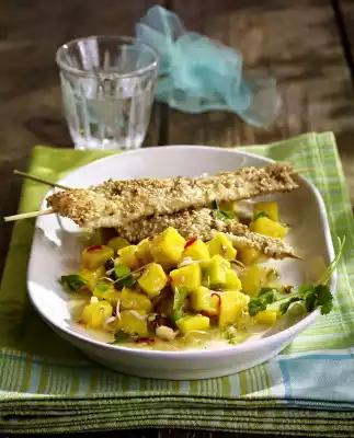Plaice Fillet Saté Skewers In Sesame Coat On Mango Sprouts Salad With Ginger, Coriander And Chili