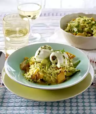 Poached Plaice Rolls With Pesto Filling On Coconut-curry Rice With Mangetouts And Peppers