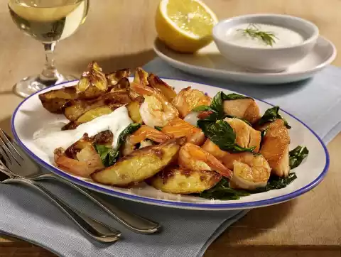 Salmon And Prawns Pan With Roasted Potatoes And Lemon Yoghurt Dip