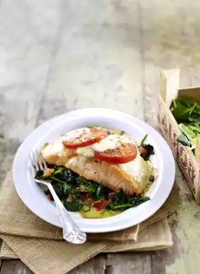 Salmon Au Gratin On Tomato Spinach