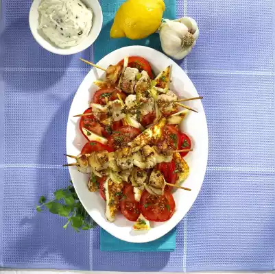 Souflaki With Halloumi Tomato Salad