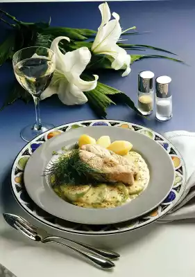 Salmon Cutlet On Cucumber Vegetables In Mustard Sauce