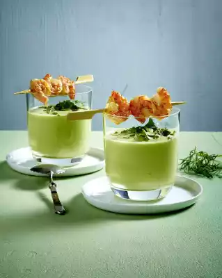 Cold Avocado Soup With Prawn Skewers
