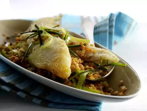 Fried Fish On Red Balsamic Lentils